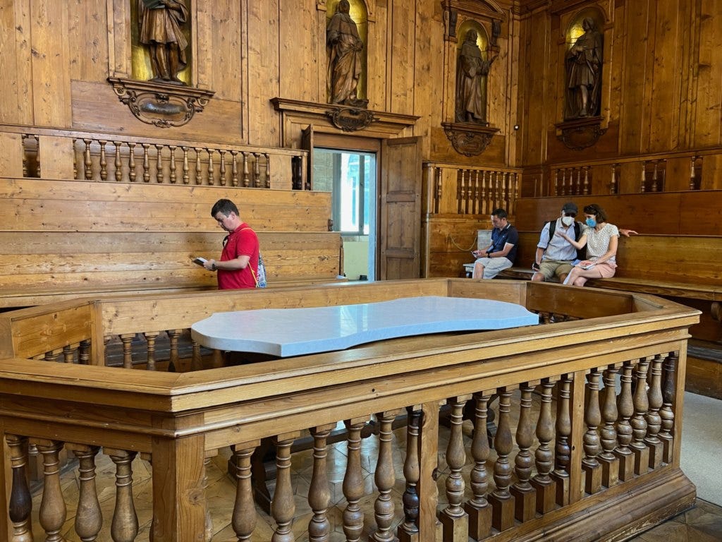 Afterward, we went to the Biblioteca dell’Archiginnasio to see the famous library and the medical theater. This was the first place people studied the human body through post-mortem dissections. It is the foundation of modern medicine and understanding of the human anatomy and was pretty damn cool. The marble slab used to study the first cadavers still sits in the center of the room, which is both morbid and strangely fascinating. For me, the carved wooden ceiling was even more interesting as dozens of intricately carved statues and symbols are in every square of the ceiling. It is truly magnificent, and you could look at it for hours studying the fantastic details.