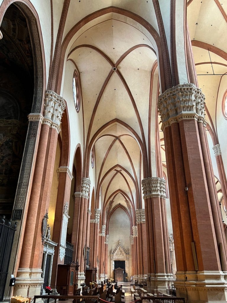 We scoured lists of “must-see” attractions and set out to see the one museum we thought was worth the price of admission. After that, we planned to walk by and in as many cathedrals as possible. This trip proved that Crystal cannot walk past a European cathedral with an open door. We went to the Basilica de San Petronio since it was open and found it very impressive inside. The outside of the building is a little odd, almost like it’s half finished, which we found out is exactly the case. They never finished the outside and never will. The inside, however, is pretty amazing. The arched vaulted ceilings are incredibly tall, and we learned the plan was to build this church larger than St Paul’s in Rome, but the pope got word of that and squashed the plan. It is still one of the largest in Europe at 132m long. The artwork inside was varied and exquisite, including wood carvings, stone sculptures, and striking paintings.