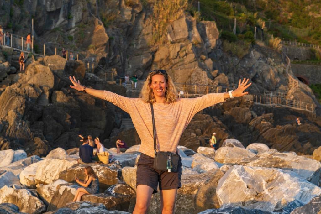After the feast, we went down the rocky sea wall to find a spot for sunset photos. Crystal was a trooper and climbed the rocks with me to get the best vantage point to see the sun going down on the left and the colorful buildings to the right. Riomaggiore’s orientation is completely different than Manarola the night before but equally beautiful. Where the sunlight illuminates Manarola directly, terrain blocks some of the light at sunset in Riomaggiore. The beauty of the evening comes from the indirect lighting and color of the sky reflecting off the colorful buildings. There was also something about sitting on the sea wall surrounded by water that made the experience better than the night before. People argue which town is the better sunset location, but, for me, it’s’ difficult to compare them because they offer very different experiences. It would be best to see them both because everyone likes something different in a sunset.