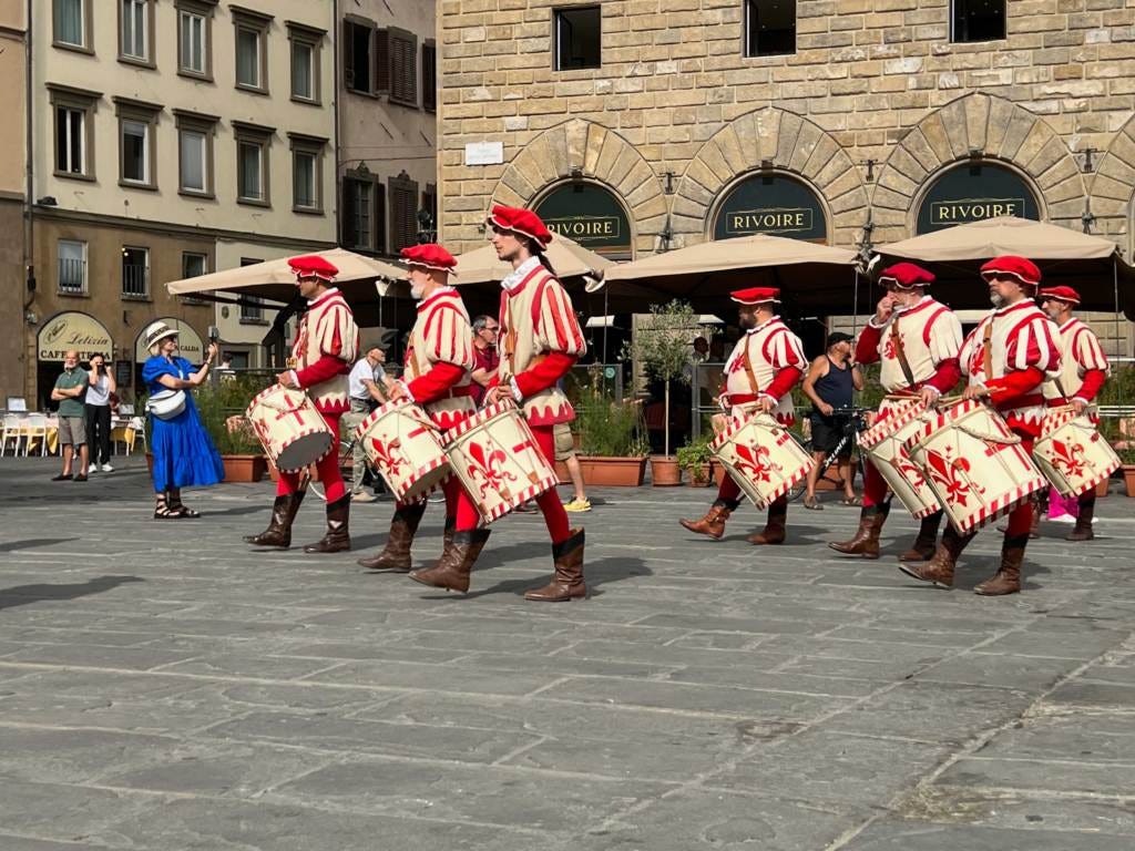 The day of shopping. We had a plan, hit the parade at Piazza Vecchio that began the day’s festivities, and then shop. We started the day according to plan as we got to the square in time to see the parade arrive in all its pageantry with buglers, drummers, and costumed people waiving their county/family flags. We watched them do their thing while the leaders went inside the Palazzo Vecchio to get the ceremonial candles to bring to the Duomo.