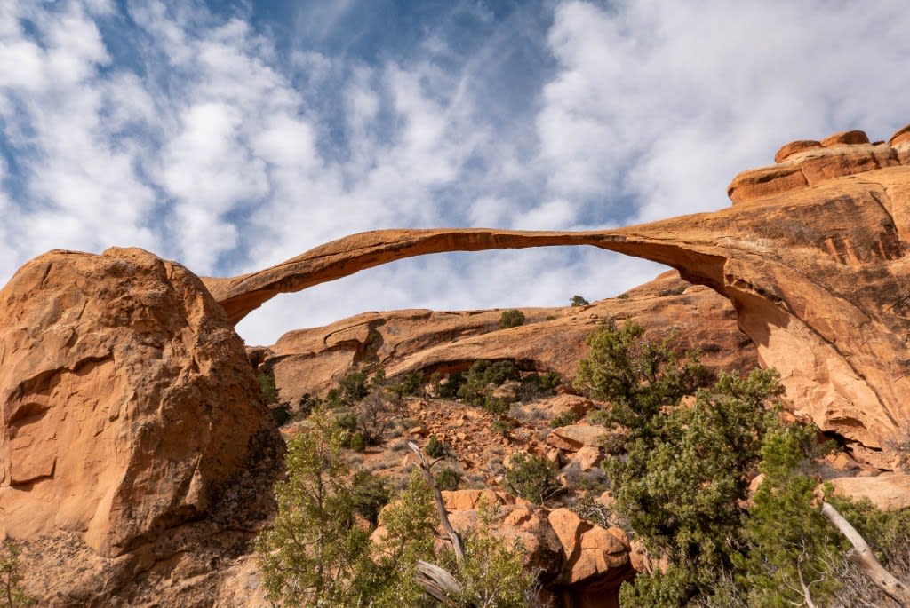 Once we had our fill of Delicate Arch, it was off to the trails at Devil’s Garden, where you have access to many arches, the most popular being Landscape Arch. After exploring some of the sideshow arches (Tunnel and Pinetree), we hit Landscape Arch. It is an impressive sight, but you are kept at bay compared to other arches. Apparently, a near-miss several years ago when 60 tons of rock broke loose and collapsed under the arch convinced the park that visitors don’t need to get that close anymore. You can still get some good photos, and the viewpoint is close enough for you to really appreciate the rock span’s fragility. It would not be a good day if you were underneath it when anything fell.