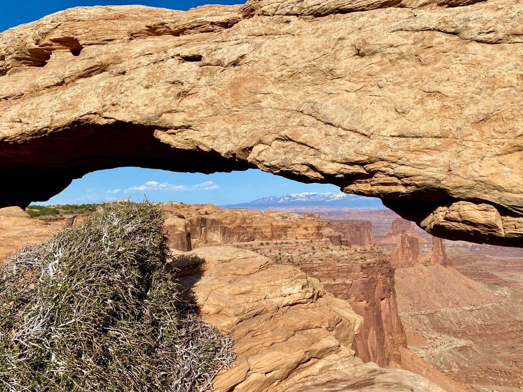 Next up was one of the most well-known and highly photographed sunrise spots in the park, Mesa Arch. Our visit was late in the afternoon, so the lighting wasn’t exactly superb, but the view through the arch across the canyon is still magnificent. It’s a very short hike to get to the arch, and the only difficult thing about it when we were there was the wind. It was a blustery day, and the area around the arch is very sandy, which meant we also became very sandy.