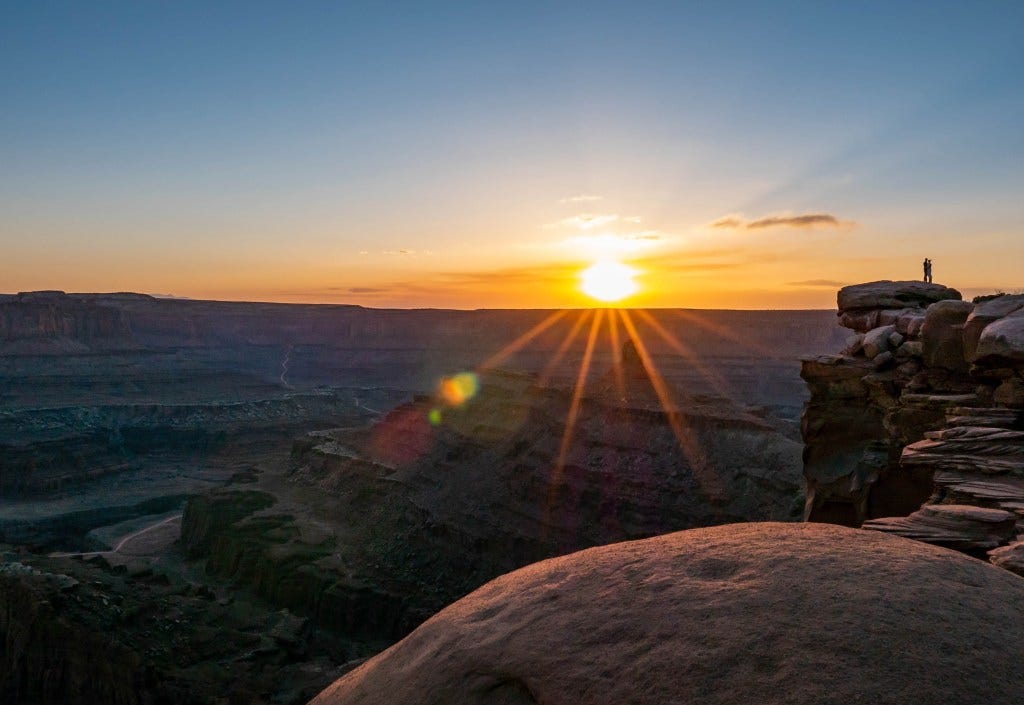 As the sun accelerated toward the western horizon, we made our way to Dead Horse Point State Park. It’s only about 15 minutes from the Canyonlands entry, so the transit is pretty straightforward. Once we paid our fee, it was a short drive to the lookout point. There is a decent amount of parking, but if you want to be there for sunset, I suggest arriving at least an hour and a half early. The overlook areas are well laid out, and there is a meandering “trail” that runs along the canyon’s rim.