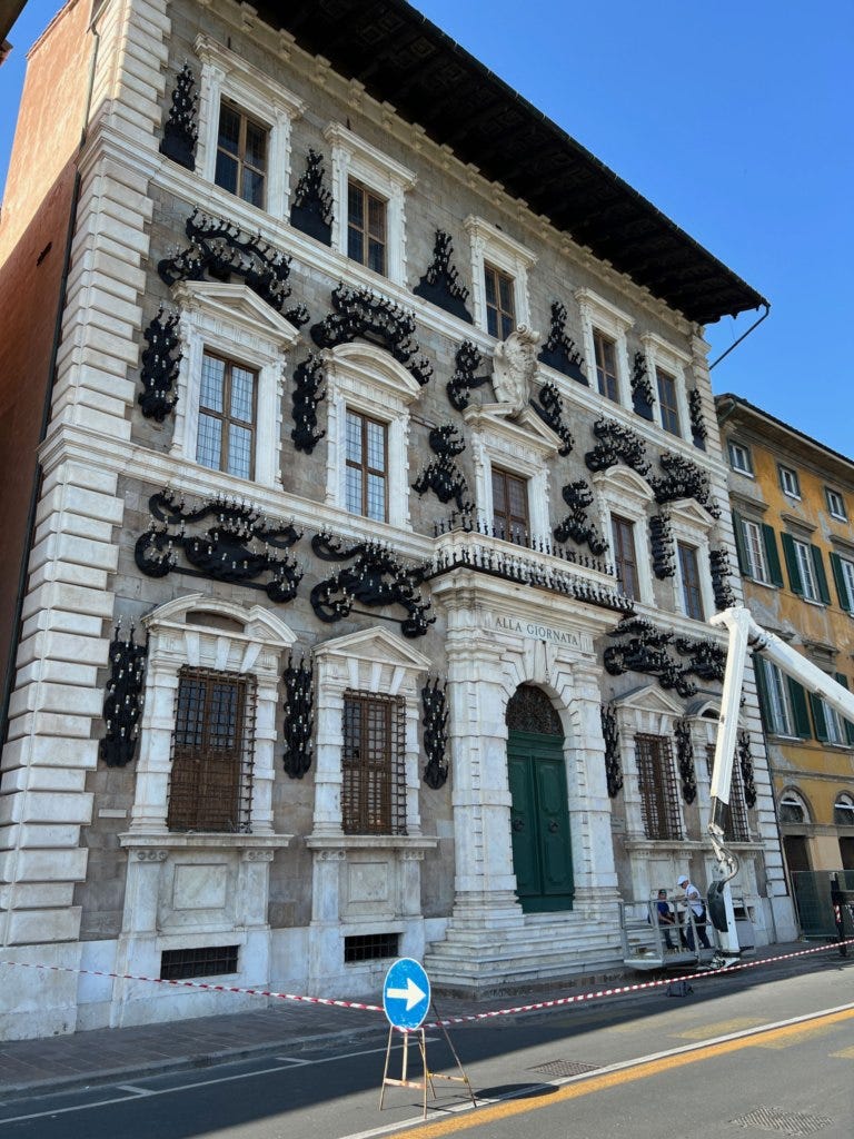 Crystal wanted to see a small church in town along the river, so we walked into the heart of Pisa. When we reached the river, the church was covered in scaffolding for renovations, so no photos or tours were to be had. All was not lost as we stumbled upon preparations for an annual festival of lights that was set to begin later that night. The Luminaria festival celebrates the patron saint of Pisa. All the buildings along the river were decorated with candles, and several firework barges were anchored in the river. Too bad we couldn’t be there for the night because I bet it looked terrific. It was time to catch our train back to La Spezia and call it a day. Overall, the day trip turned out much better than I expected, which is always nice.