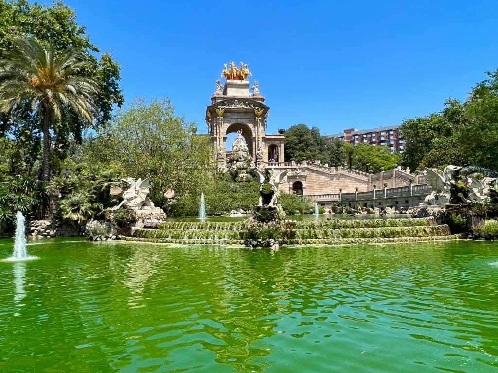 After returning to Barcelona, we walked around the “central park” of the city, where we saw the very cool dragon-themed sculpture and fountain called the Cascada del Parc de la Ciutadella. Lots of gold, statues, and moss are growing on the dragons and the actual waterfalls, which is very odd.